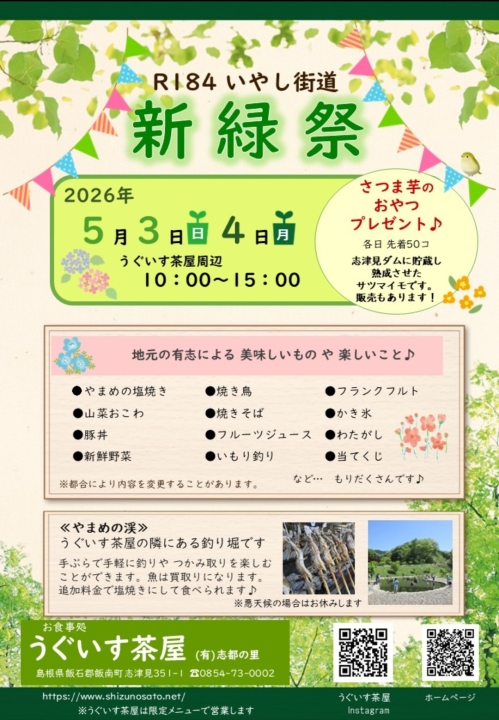 2026.04.21 【5/3(日)・4(月祝)】R184いやし街道 新緑祭 inうぐいす茶屋周辺 5月3日・4日の2日間、うぐいす茶屋周辺にて新緑祭開催です! うぐいす茶屋の駐車場にテントが並び、様々な出店を楽しめます♪ 先着50名に地元の志津見で栽培し、志津見ダムで熟成・貯蔵された【さつま芋のおやつ】をプレゼント!! やまめの渓では手ぶらでできるやまめの釣り堀もやっています。 釣った魚は塩焼きにして食べることもできますよ! ぜひお越しください! 【日時】 5月3日(日)・4日(月・祝) 10:00~15:00 【場所】 うぐいす茶屋周辺 飯南町志津見351-1