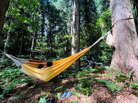 ハンモックやマットを使って森でリラックスする時間をとります。